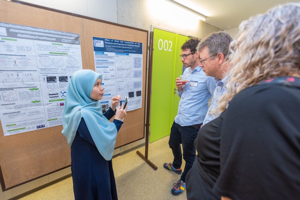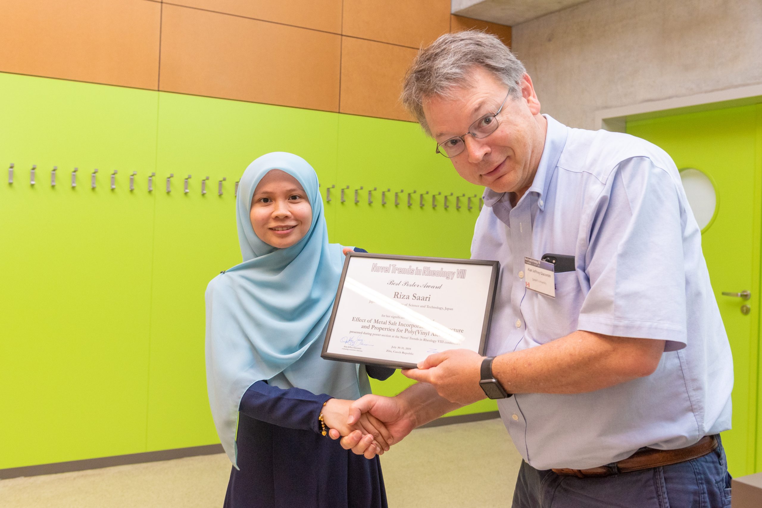 Riza Saari (left) receiving the Best poster award from Alan Jeffrey Giacomin (right) for her poster ‘Effect of Metal Salt Incorporation on Structure and Properties for Poly(Vinyl Alcohol) ’. The poster section was judged by Alan Jeffrey Giacomin (chair), Paula Marie Wood-Adams and Savvas George Hatzikiriakos.
