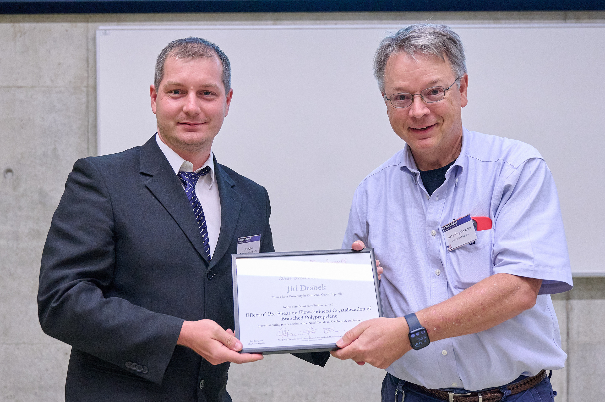 Jiri Drabek (left) receiving the Best poster award from Alan Jeffrey Giacomin (right) for his poster ʺEffect of Pre‐Shear on Flow‐Induced Crystallization of Branched Polypropyleneʺ. The poster section was judged by Alan Jeffrey Giacomin (chair), Paula Marie Wood-Adams and Savvas George Hatzikiriakos.