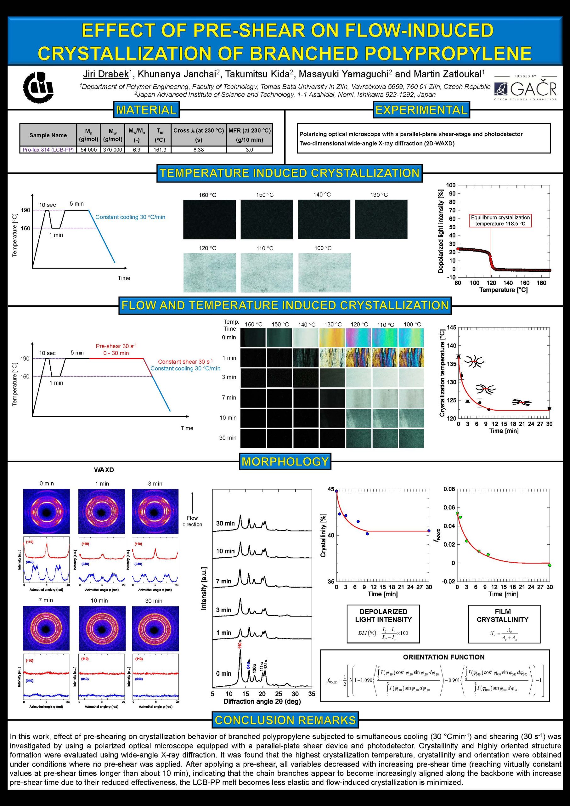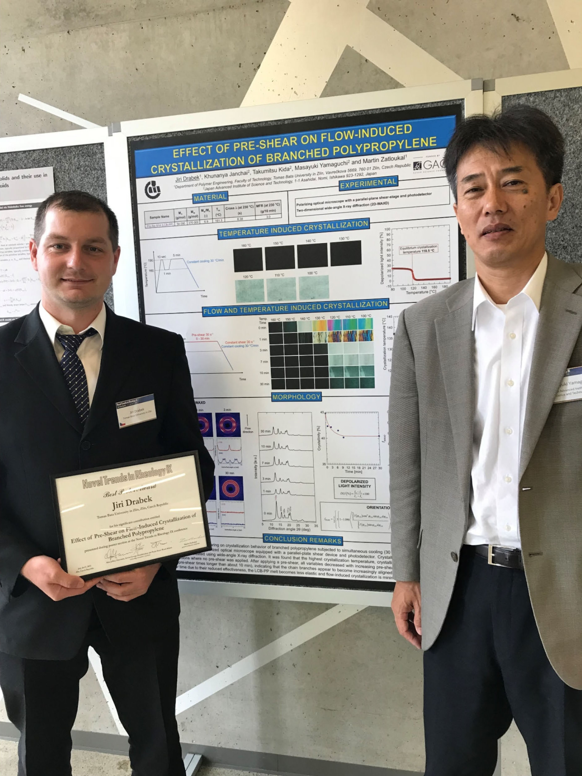 The winner of the competition for the best poster Jiří Drábek (left) for the work entitled ʺEffect of Pre‐Shear on Flow‐Induced Crystallization of Branched Polypropyleneʺ, which he carried out as part of a one‐month internship at the Japan Advanced Institute of Science and Technology in 2022 under the supervision of Prof. Yamaguchi (right).