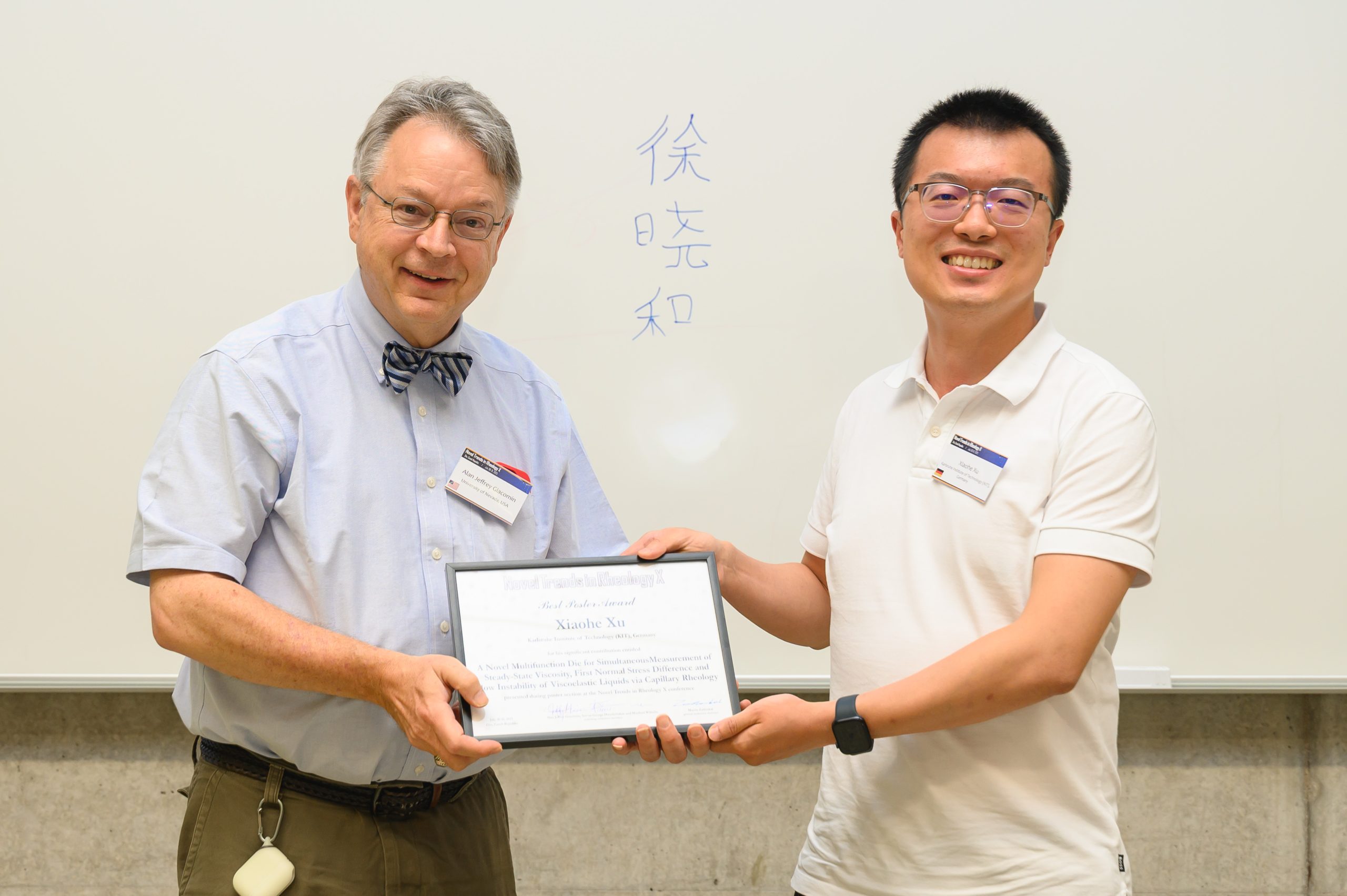 Xiaohe Xu (right) receiving the Best poster award from Alan Jeffrey Giacomin (left) for his poster ʺA Novel Multifunction Die for Simultaneous Measurement of Steady-State Viscosity, First Normal Stress Difference and Flow Instability of Viscoelastic Liquids via Capillary Rheologyʺ. The poster section was judged by Alan Jeffrey Giacomin (chair), Manfred Wilhelm and Savvas George Hatzikiriakos.