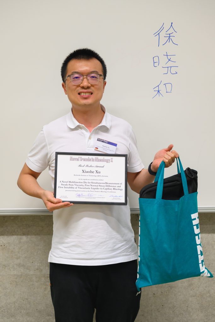 The winner of the competition for the best poster Xiaohe Xu for the work entitled ʺA Novel Multifunction Die for Simultaneous Measurement of Steady-State Viscosity, First Normal Stress Difference and Flow Instability of Viscoelastic Liquids via Capillary Rheologyʺ with a prize from the main sponsor of the conference, NETZSCH.